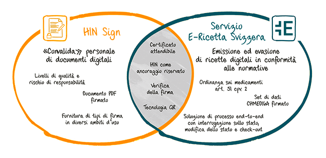 I «gemelli dizigoti» HIN Sign e servizio E-Ricetta Svizzera hanno molti aspetti in comune ma differiscono in alcuni punti fondamentali.HIN Sign è il servizio di firma elettronica di HIN che può essere impiegato per firmare la maggior parte dei documenti di uno studio medico come, ad esempio, certificati di inabilità al lavoro, impegnative ecc. Tuttavia, la firma con HIN Sign non è sufficiente né per l’emissione di ricette per medicamenti che rientrano nell’Ordinanza sugli stupefacenti né per la prescrizione di un ricovero a scopo di assistenza. HIN Sign non va utilizzato nemmeno per l’emissione di ricette elettroniche poiché, a tale scopo, esiste il servizio E-Ricetta Svizzera.Anche il servizio E-Ricetta Svizzera utilizza la firma elettronica nel processo di emissione ma la ricetta elettronica stessa viene emessa e firmata in un’applicazione appositamente sviluppata. Il vantaggio del servizio E-Ricetta Svizzera risiede non solo nel fatto che i dati della ricetta vengano firmati ma che, dopo la sua evasione, la ricetta venga convalidata – di conseguenza non vi è alcun rischio di utilizzo improprio come l’evasione multipla della stessa ricetta. Al contempo, anche la consegna dei medicamenti viene gestita digitalmente, ovvero la farmacia che evade la ricetta rileva immediatamente quale medicamento è stato prescritto dal medico e in quale formato.